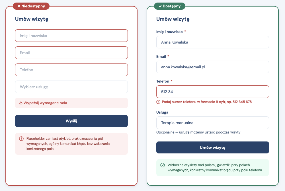 Formularz rezerwacji to zwykle najważniejszy element strony gabinetu. I niestety, to właśnie formularze bywają najbardziej problematyczne pod kątem dostępności. Na co zwrócić uwagę: